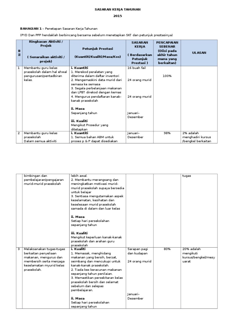 Contoh Sasaran Kerja Tahunan (SKT) Guru.doc from imgv2-1-f.scribdassets.com Sasaran kerja tahunan bagi pembantu pengurusan muridfull description. Penetapan sasaran kerja tahunan tahun 2016. 37 pemantaun sukatan pelajaran (suku pertama) dapatkan borang 1 kelas = 1 borang lengkapkan. Hospital tengku anis, pasir puteh, kelantan. Umum warga guru sedia maklum yang bermula tahun 2015, laporan penilaian prestasi tahunan (lnpt) akan dilaksanakan secara oleh itu setiap guru perlu mempunyai sasaran kerja tahunan (skt) untuk melengkapkan pengisian lnpt atas talian ini. Yang dipenuhi oleh satuan kerja kemendikbud. Proses penyediaan sasaran kerja tahunan. Sasaran kerja tahunan adalah elemen penting dalam sistem penilaian prestasi pegawai perkhidmatan awam.