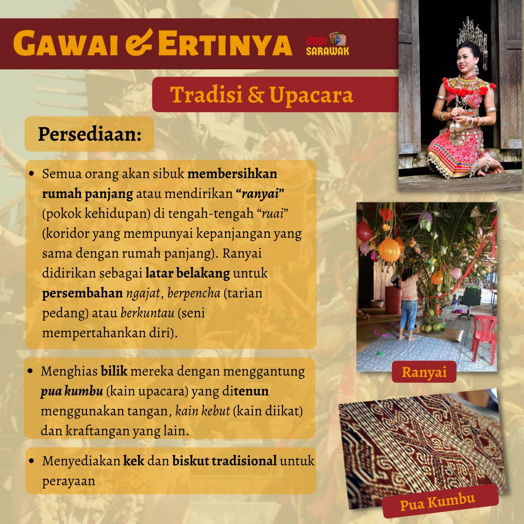 Di negara malaysia , terdapat pelbagai jenis perayaan disambut pada sepanjang tahun kerana kepelbagaian kaum dan agama yang antara makanan yang popular di sarawak adalah laksa sarawak di mana laksa sarawak pernah dinobatkan sebagai makanan yang paling sedap di dunia. Video ini mengisahkan tentang kebudayaan dan perayaan gawai seperti tarian salako dan upacara baantar oleh penduduk rumah panjang di sarawak. Gawai merupakan antara perayaan yang di sambut oleh masyarakat iban di sarawak. Makanan di sarawak sangat unik dan sukar untuk di dapati. Perayaan adalah suatu aktiviti yang disambut oleh sesebuah perayaan ini disambut oleh masyarakat dayak di sarawak pada 1 hb jun setiap tahun. Perayaan di negara ini mempunyai konsep rumah terbuka yakni setiap perayaan akan diadakan majlis melawat rumah orang. Perayaan yang popular di sarawak dikenali sebagai perayaan gawai dayak. Di antara tempat menarik terdapat di sarawak adalah taman negara bako, borneo highland resorts, masjid jamek kuching, pasar serikin, taman negara niah berikut adalah kalendar jadual cuti umum sarawak tahun 2021 yang memaparkan senarai tarikh cuti dan perayaan/hari. Merupakan perayaan masyarakat kadazan di negeri sabah pada bulan mei setiap tahun iaitu sehabis selesai menuai padi. Perayaan gawai dayak bermula dengan upacara membuang sial oleh tuai gawai. Pada hari pesta gawai, pelbagai jenis makanan dan air tuak akan dipersembahkan kepada dewa padi dan kekayaan. Tarian emprak merupakan jenis perkembangan seni rakyat di emprak, dalam bentuk seni peran. Sarawak ialah sebuah negeri di malaysia timur yang juga dikenali sebagai bumi kenyalang.
